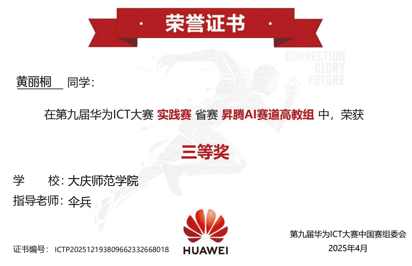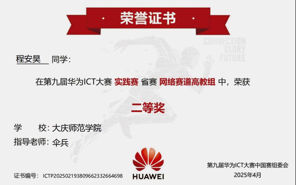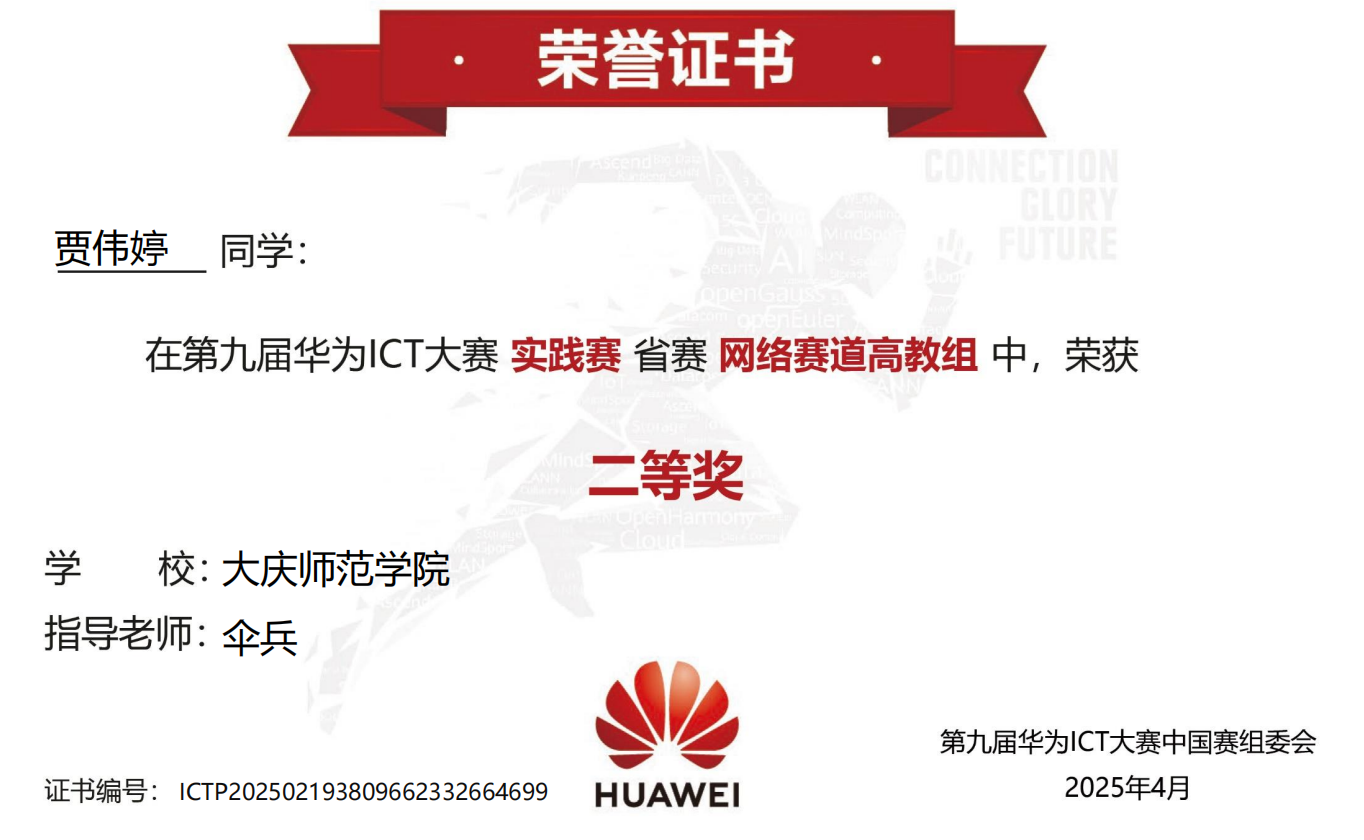 近日,第九届华为ICT大赛2024-2025实践赛圆满落幕。大庆师范学院机电工程学院2023级物联网工程专业学子程安昊、贾伟婷、经文生、乔子明、黄丽桐、李思齐等6人,从全国众多参赛院校参赛选手中脱颖而出,斩获网络赛道高教组实践赛、昇腾AI赛道省级二等奖、省级三等奖,以扎实的实操能力彰显校企合作办学实践育人成效。