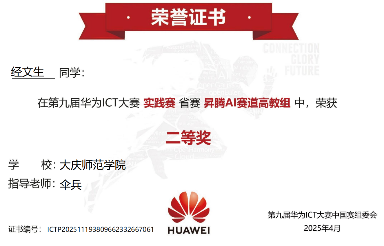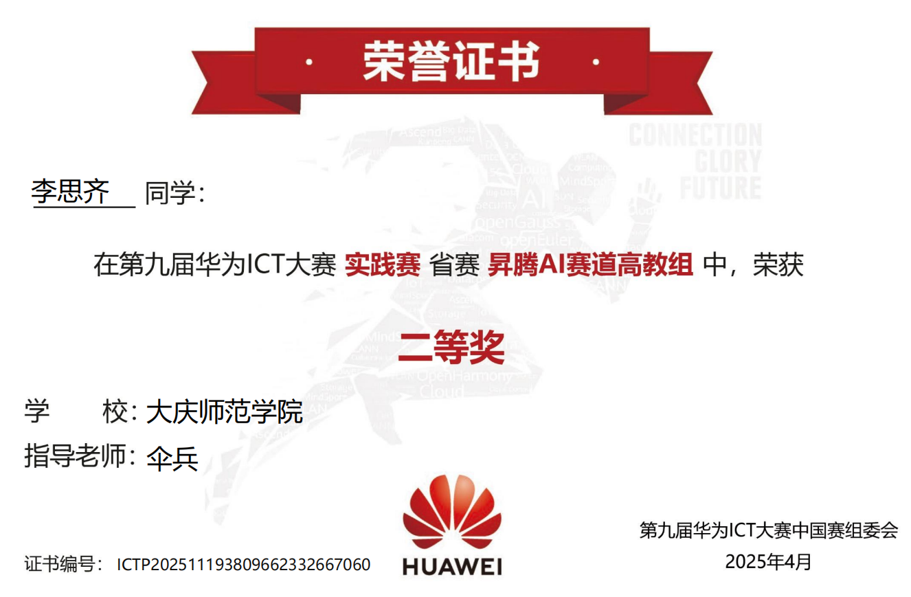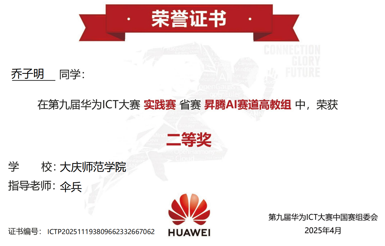 近日,第九届华为ICT大赛2024-2025实践赛圆满落幕。大庆师范学院机电工程学院2023级物联网工程专业学子程安昊、贾伟婷、经文生、乔子明、黄丽桐、李思齐等6人,从全国众多参赛院校参赛选手中脱颖而出,斩获网络赛道高教组实践赛、昇腾AI赛道省级二等奖、省级三等奖,以扎实的实操能力彰显校企合作办学实践育人成效。