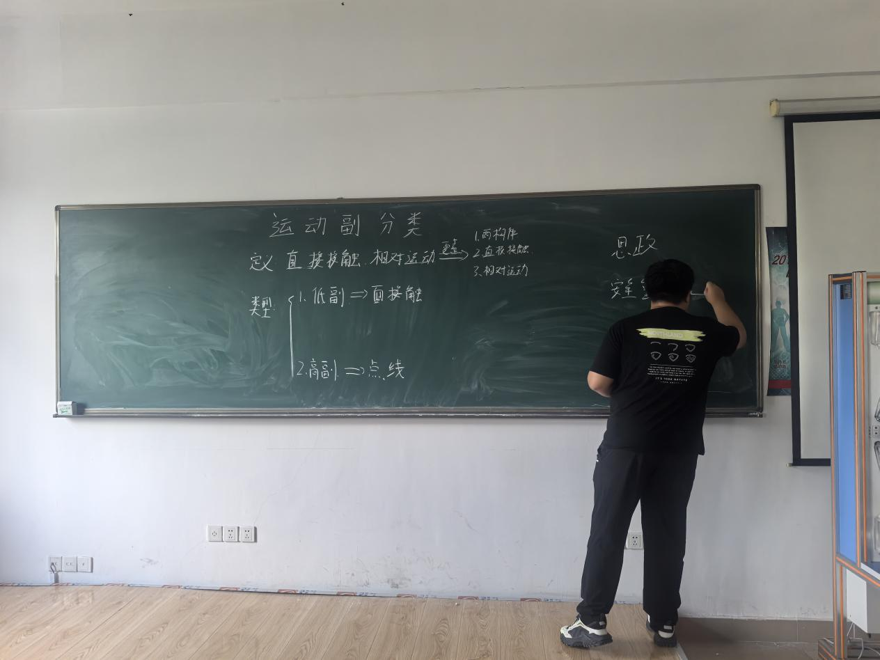 在试讲环节,两位老师结合课程定位与学生认知特点,展现出扎实的教学功底与清晰的教学设计思路。其中,孙浩钋老师以《机械设计基础》中“运动副分类”为核心教学内容,孙老师先讲解了运动副的定义,再以思维导图为可视化工具,系统拆解低副与高副的结构特征。孙老师的课堂既注重知识的逻辑性梳理,又强调理论与实践的结合,让抽象的机械概念更易理解。