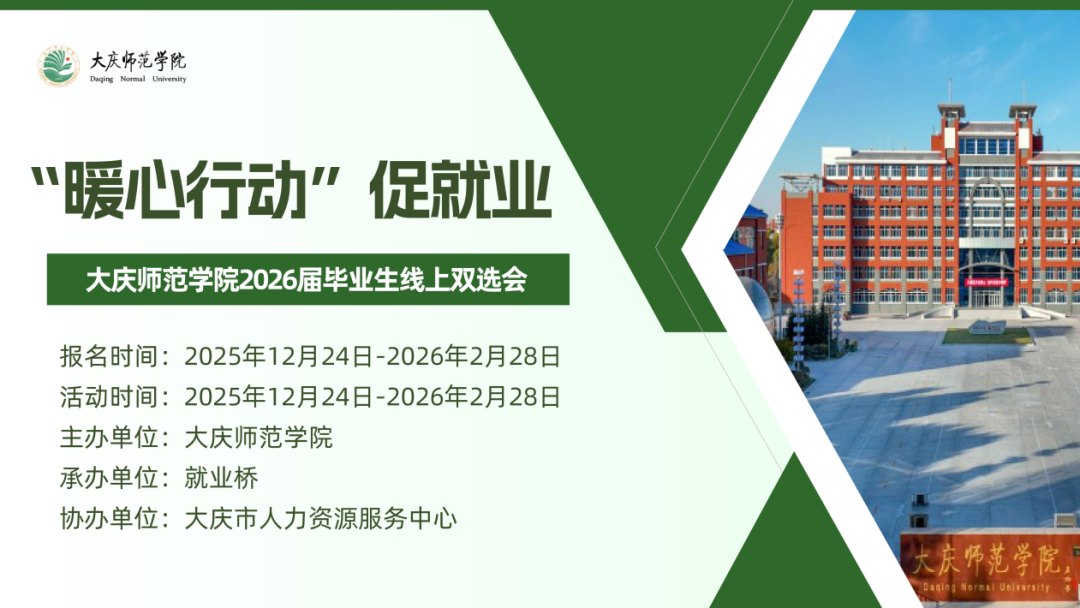 为深入贯彻落实党中央、国务院“稳就业”“保就业”的决策部署,积极响应教育部号召,我校积极深入推进2026届毕业生就业工作,充分搭建用人单位和毕业生网络双选平台,实现人才精准对接,促进毕业生更加充分更高质量就业,我校定于2025年12月24日-2026年2月28日举办“暖心行动”促就业大庆师范学院2026届毕业生线上双选会,诚邀各用人单位选聘我校优秀毕业学子。现将有关事项通知如下: